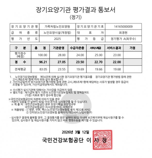 2025년7월8일 실시한 국민건강보험공단 시설평가 결과가 우리시설은 5회 연속 "최우수기관"에 선정되었습니다.