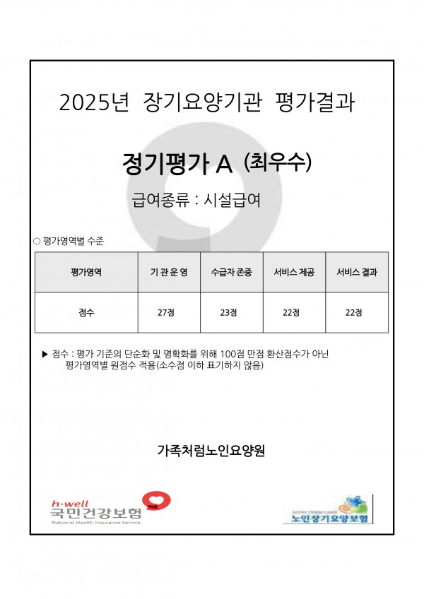 장기요양기관 평가는 기관운영, 수급자 존중, 서비스 제공, 서비스 결과 4개 영역에서 90점 이상이 되어야 최우수기관으로 선정되며 평가기간중 노인학대, 부당청구, 행정처분 등이 있는 경우 최우수기관으로 선정될수 없습니다. 전국적으로 5회연속 최우수기관으로 선정된 기관은 소수일 것으로 생각됩니다. 앞으로도 양질의 장기요양서비스 제공을 위해 최선을 다하겠습니다.